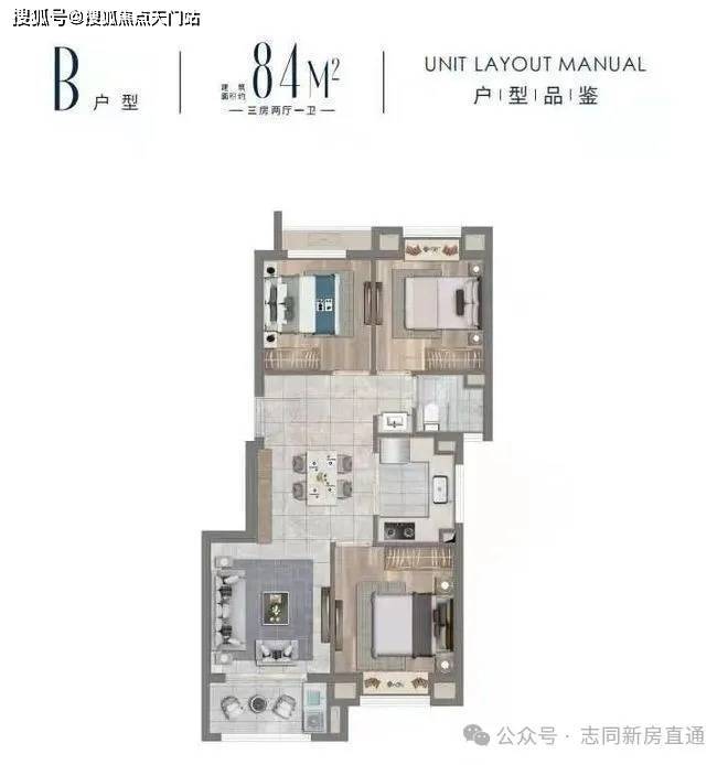 B户型建面约84㎡三房两厅一卫▼