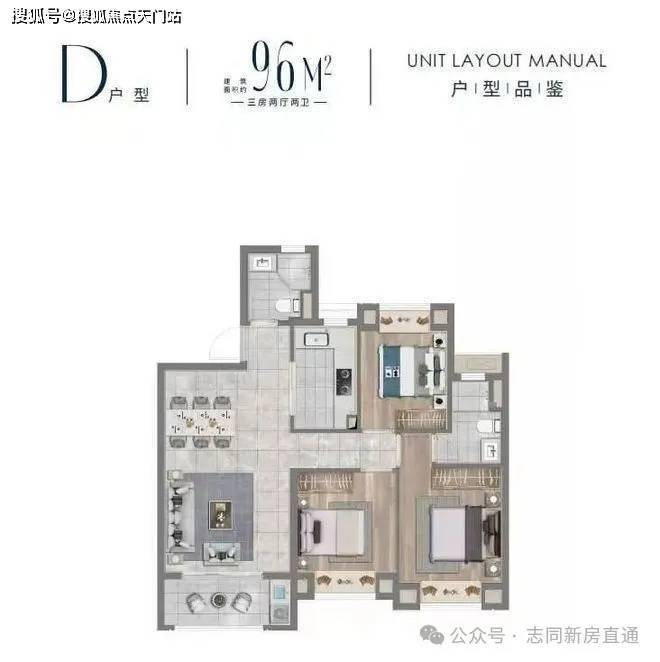 D户型建面约96㎡三房两厅两卫▼