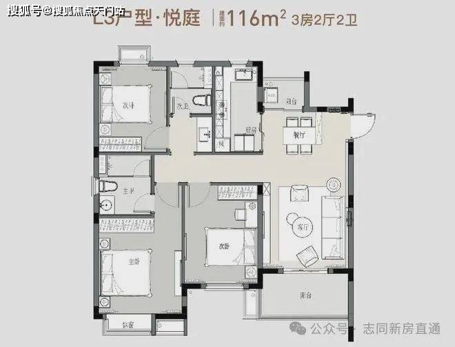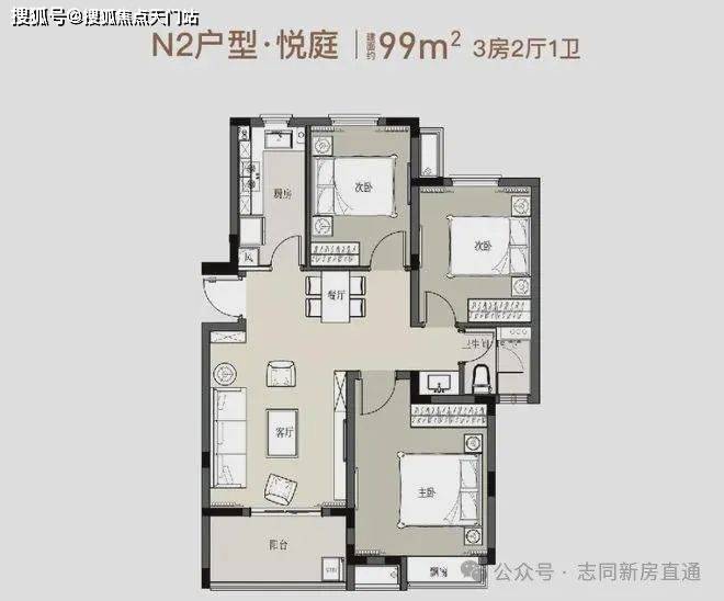 户型采用了经典的 动静分离户型、阔景飘 窗、南向客厅带阳台、主卧套房等,大大提升了内部空间的高宜居性!