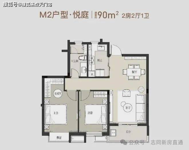 2房2厅1卫 90㎡ 户型图