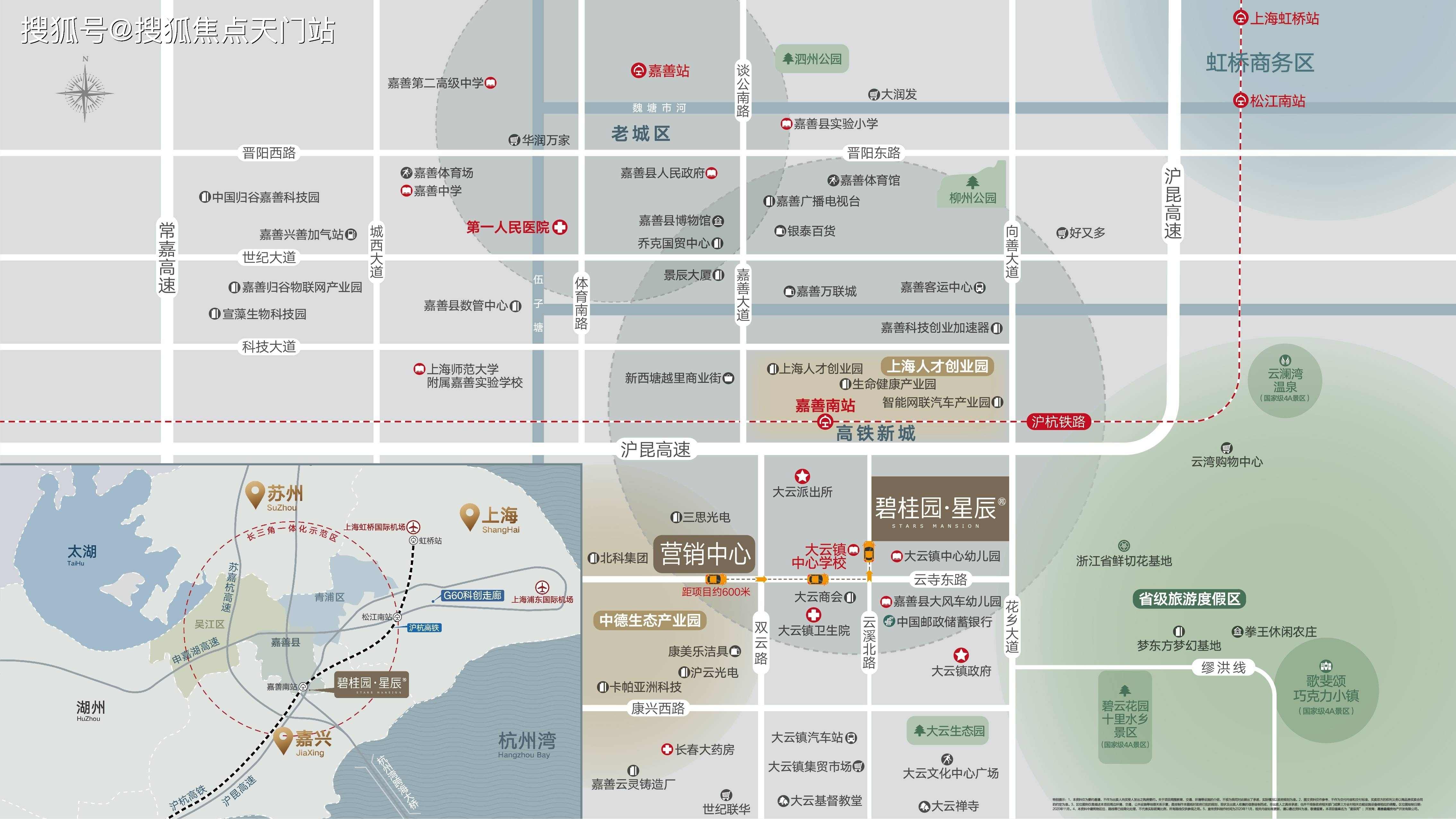 交通优势: 距嘉善南站约1.2㎞,至上海通勤高铁、动车27车次,约13分钟到达上海松江,较快约23分钟到达上海虹桥。距G92杭州湾环线高速、G60沪昆高速出入口约1.1公里,沪杭甬交通枢纽。