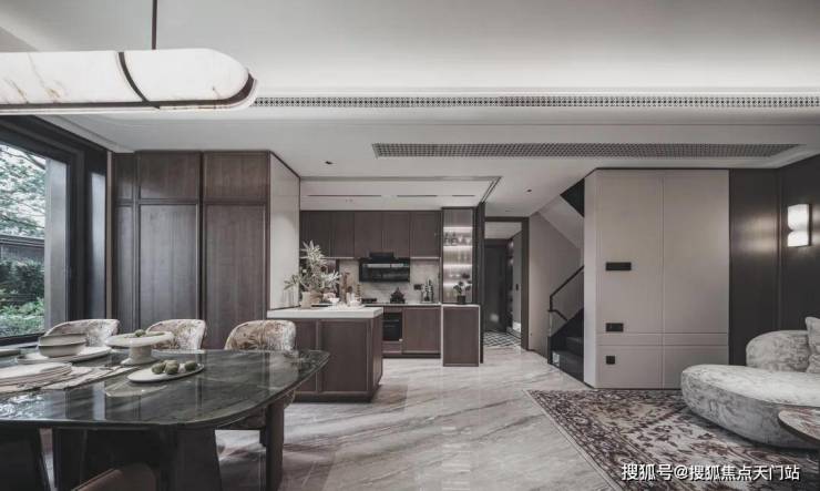 首先厨房是半开放式的岛台,让整个公区的视野更开阔,尺度更具豪宅气度。其次敞开式的厨房能让家人沟通更顺畅,温馨感提升。