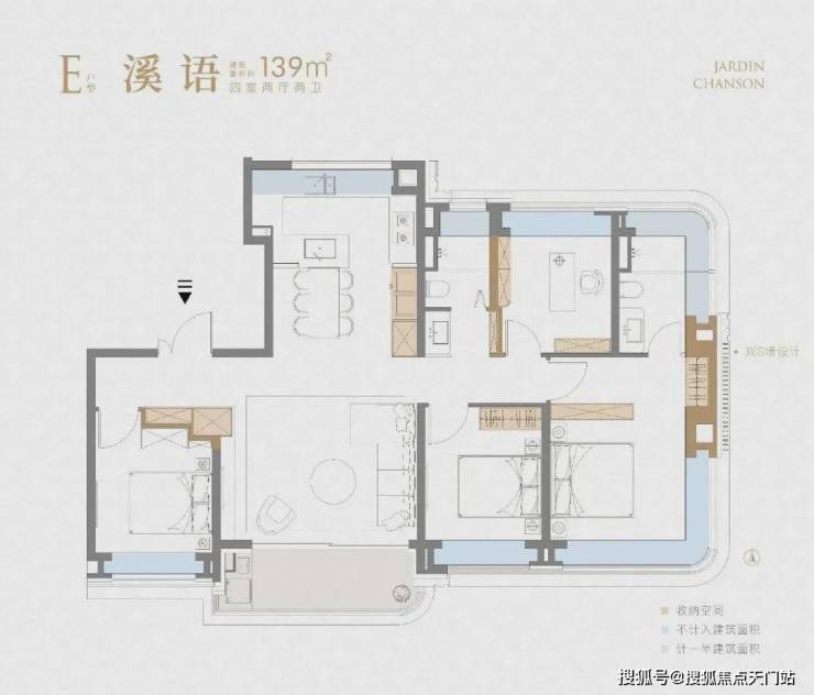 项目建面约128㎡4房户型延续了前作3S墙的设计,保证了收纳空间的丰富性。