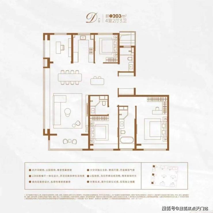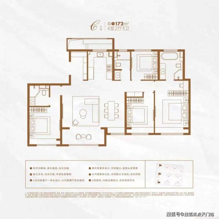 该户型集LDBK一体化、玄关入户、动静分区设计、U型厨房、双卧飘窗、强大收纳等多重优势于一体,在功能性与舒适度上几乎都做到了极致!