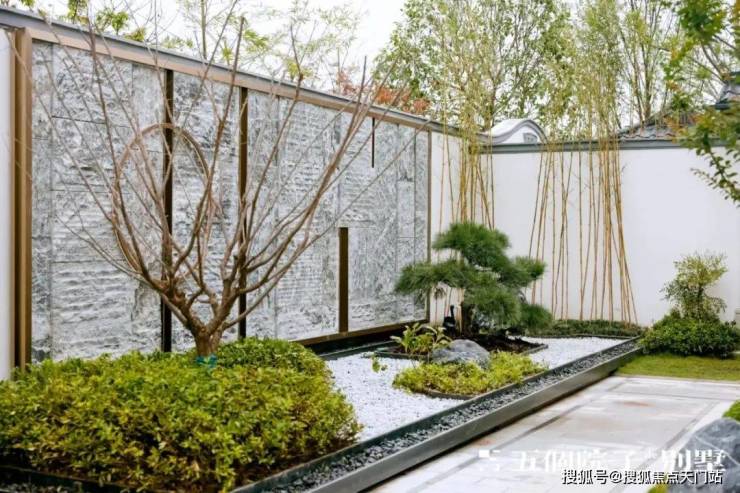 入口右侧是迎宾的组合造景,选用泰山石组景以及黑松、砾石等中式元素,和小区整体江南水乡风格相得益彰。