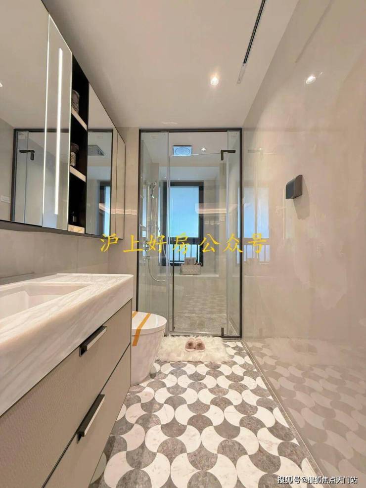 奢石台面,皮革饰面柜抽屉,侧端设置金属收纳开放格;定制镜柜,中间的透光玉石直接提升了高级感,镜柜内部配备了美妆冰箱+美妆灯条+轨道收纳!