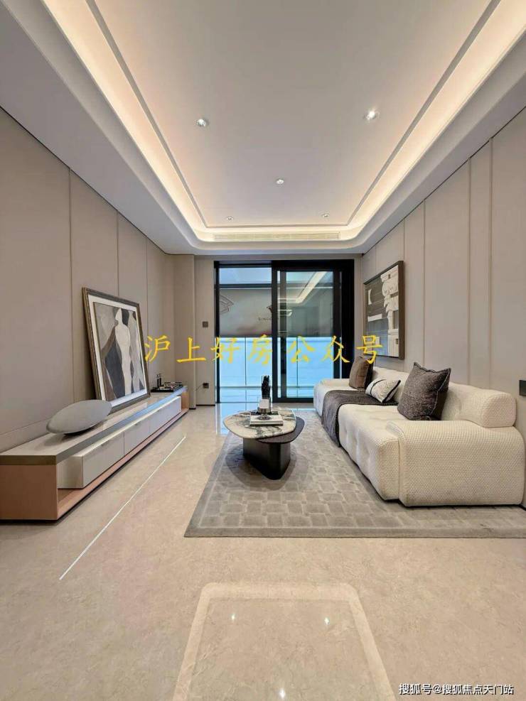 电视背景墙采用卡慕白的石材+皮革造型,弧形吊顶,相当讲究,连空调出风口的形状都打造为海上·清和玺logo山茶花的形状~~三大件为大金(或同等档次)中央空调和地暖,新风系统为百朗(或同等档次),南向阔景阳台,采光视野一级棒!