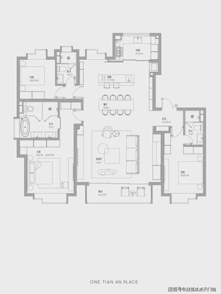 厨房、餐厅、客厅及阳台一体化设计,尺度感十足!