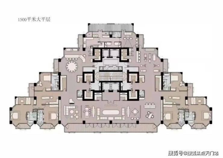 主力面积为370、750、1500㎡三个面积段,即半层、一层、半层复式、整层复式几种,南侧一栋住宅户型呈金字塔造型,四间套房,超大客餐厅,充分利用南向面宽,360°采光不浪费一丝一毫江景。