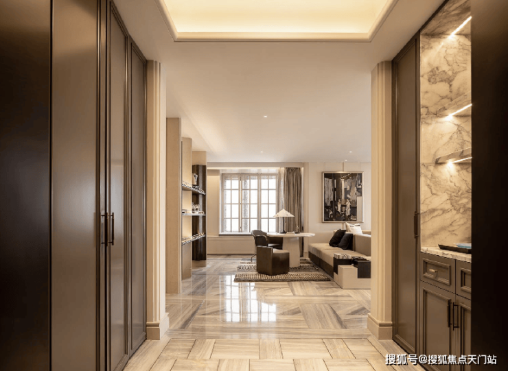 进入室内的 入户玄关收纳空间,地面采用 静雅棕、宝格丽兰石材拼花设计, 古典回形波打+实心铜条的搭配增强入户尊贵感。右侧是 山水白奢石的开放格,左侧是行李间,通过暗门的做法,将功能结合进去,强化了归家的仪式感。