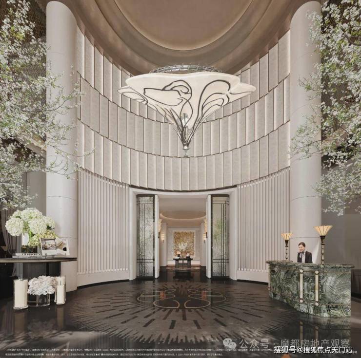 社区主入口,约58米宽、约12米高的恢弘奢阔门庭,通过将社区整体抬高,形成悬浮于公园之上的视觉张力,一幅鎏金艺术画卷在眼前徐徐展开!