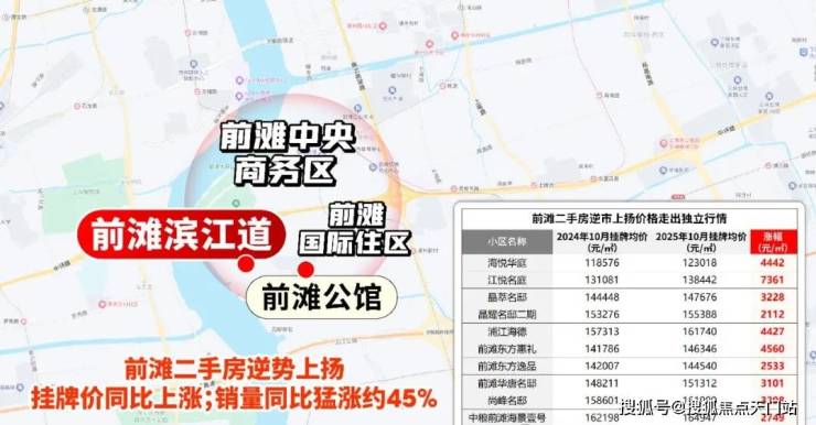 而前滩滨江超级完整体,在2025年上海楼市中交出了惊艳成绩单---当约98%的板块挂牌价同比下降时, 前滩逆势“量价齐升”,走出独立行情