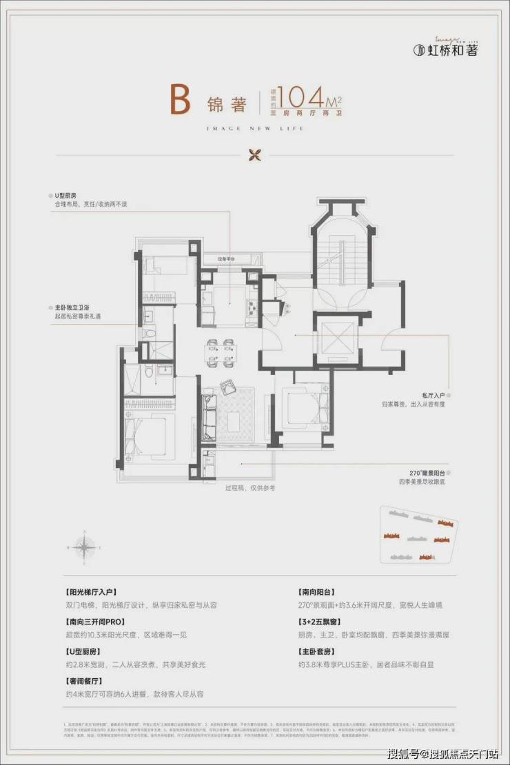 建面约104㎡舒适三房,三开间朝南+动静分区,设计水准颇高。特别是宽景阳台的设置,为客厅配备一幅iMax广角视野,多角度观赏社区美景,适配对品质有需求的首置或首改客户。