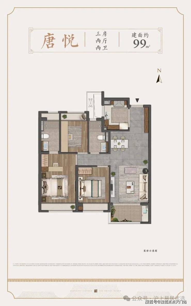 约99㎡3房2卫,汇聚了市面上优秀户型应该有的大多数特质。