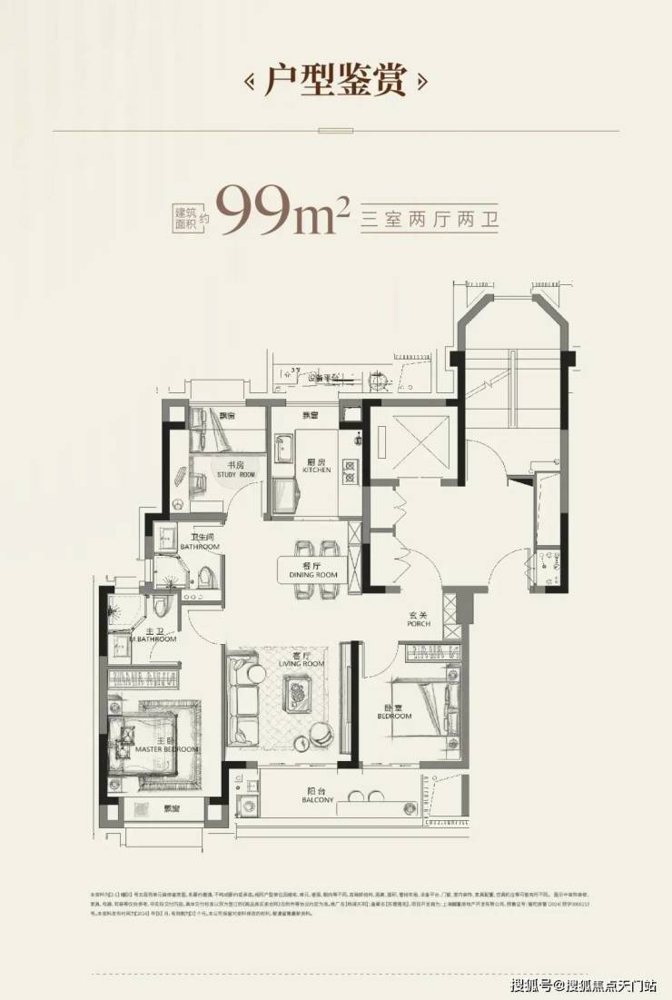 建面约99㎡经典飞机户型设计,南北通透,作息空间互不干扰; 集约化过道+多飘窗设计,视觉向外延展性更大,整体户型开阔感更强; 独立玄关+双卫配置,保证了业主足够的私密性和舒适度; 南向次卧与阳台相连,使得室内尺度、采光及通透性都十分出彩。