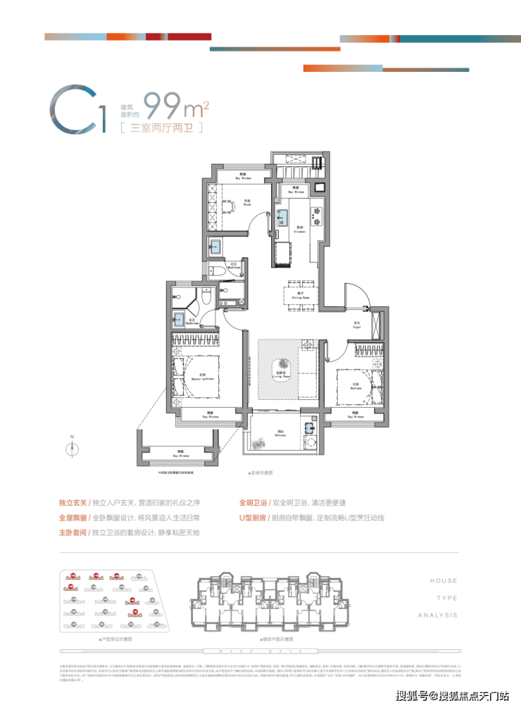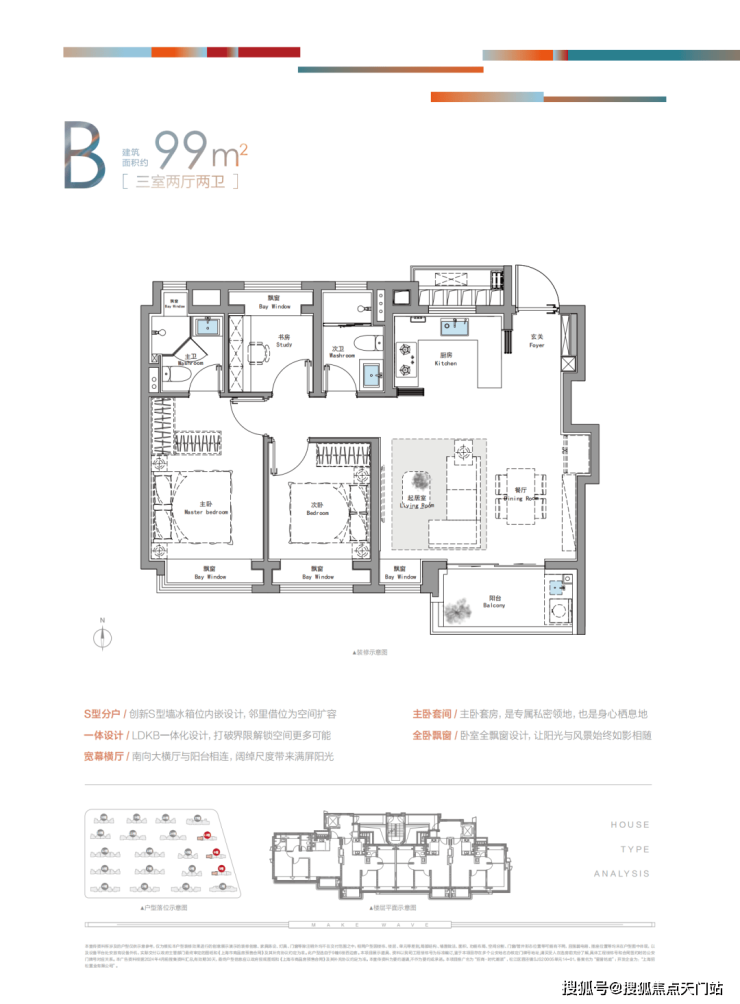 建面约99㎡B户型客餐厅配置 超大尺度横厅, 全卧室飘窗就连主卫也配置了一个飘窗;
