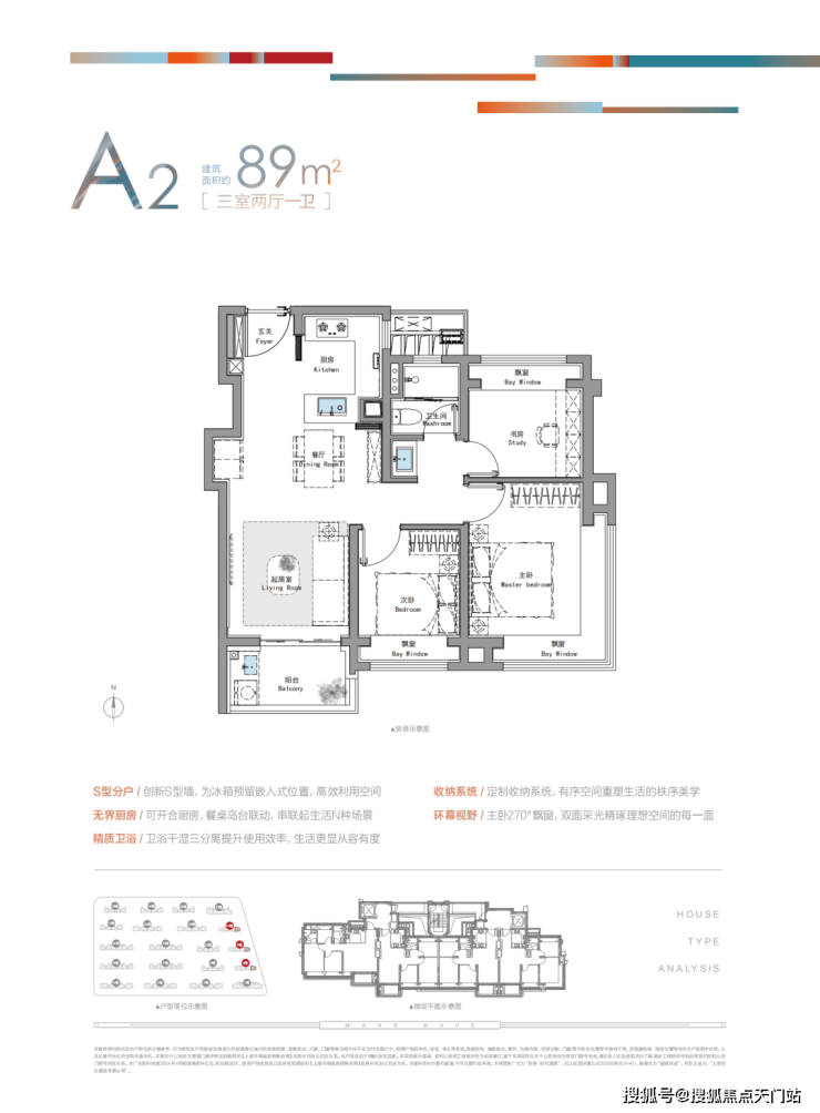 建面约89㎡3房东边套主卧配置约 270°双向采光飘窗、S墙设计;