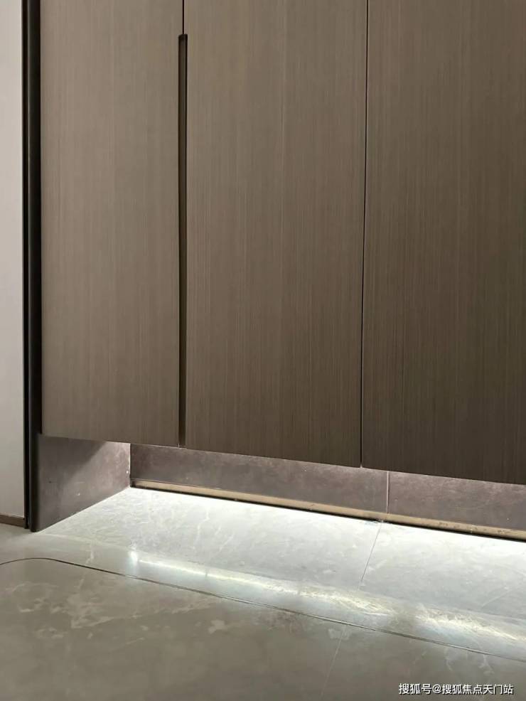 鞋柜下方做了 悬浮处理,同样也是 内嵌灯带,这里灯光的角度还会再调整,因为灯光映射在大理石地面上,要显得尽量柔和不刺眼;同时,鞋柜下方可放拖鞋,还能放扫地机器人,便于日常清扫打理。
