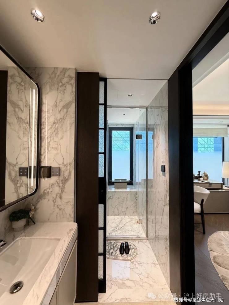 收纳细节上,二期户型中完美继承了一期的收纳系统,玄关收纳,整面内嵌柜体一直延伸到餐边柜;厨房全屋定制的柜体;卫浴的镜面柜和美妆冰箱等等,主卧卫生间的进一步升级:洗手台与化妆台相对,拥有三面镜柜,视觉空间进一步扩展和延伸。