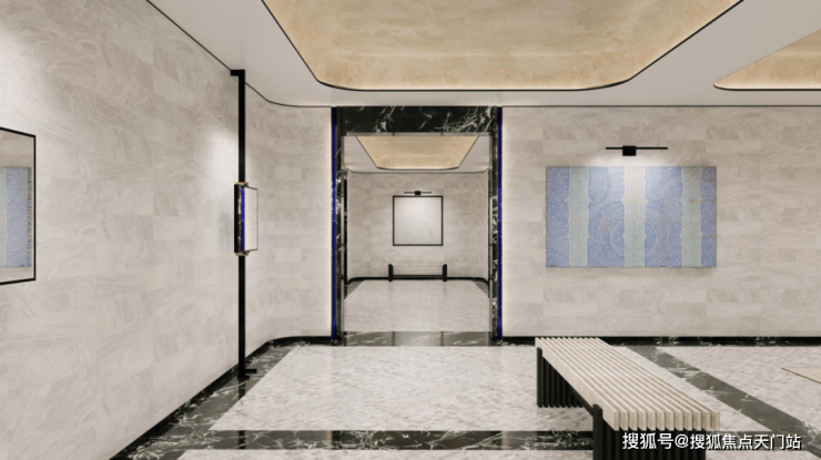 大堂前厅有别于大部分地库的设计,做了酒店式的体验。全石材的地面,顶上是一块艺术漆,周边陈列着青年艺术家的定制画作,打造艺术展览般的场景体验,业主们可以在这里放松心情,欣赏艺术,静下心来感受这处与外界不同的艺术空间。