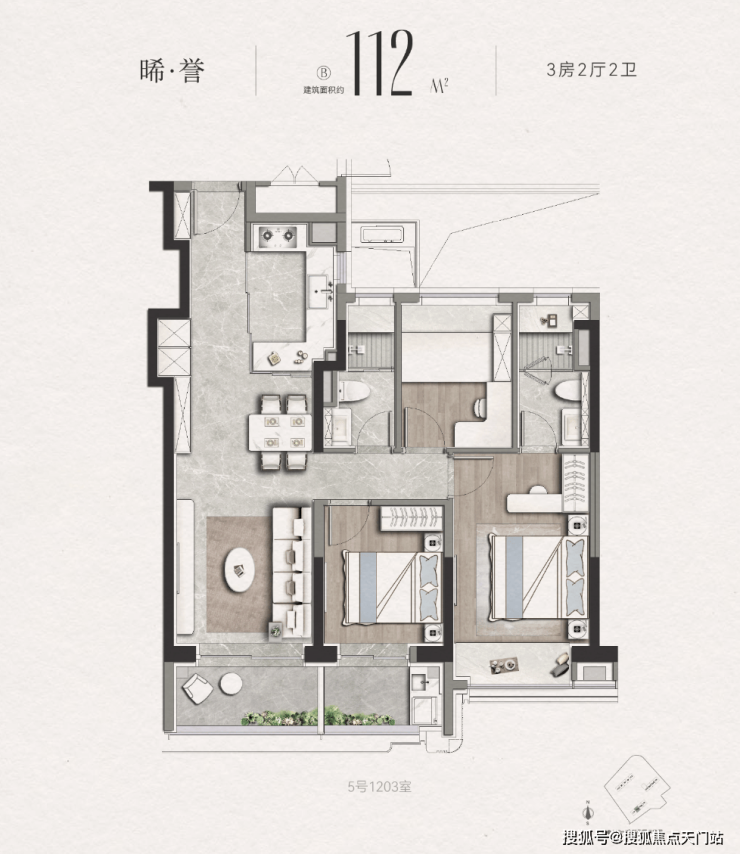 边套A户型是三面采光户型,客厅连接阳台,视野出众。