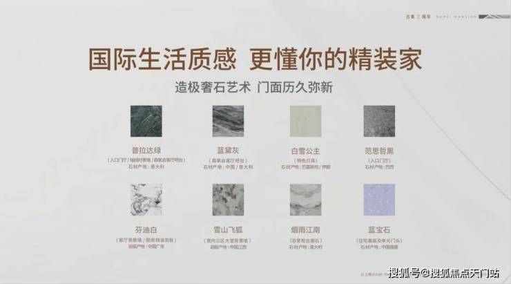 古美阅华采用了高阶灰白配色,搭配厚重蓝宝石石材,与斜切古铜色铝板,勾勒厚重、精致建筑美学立面。