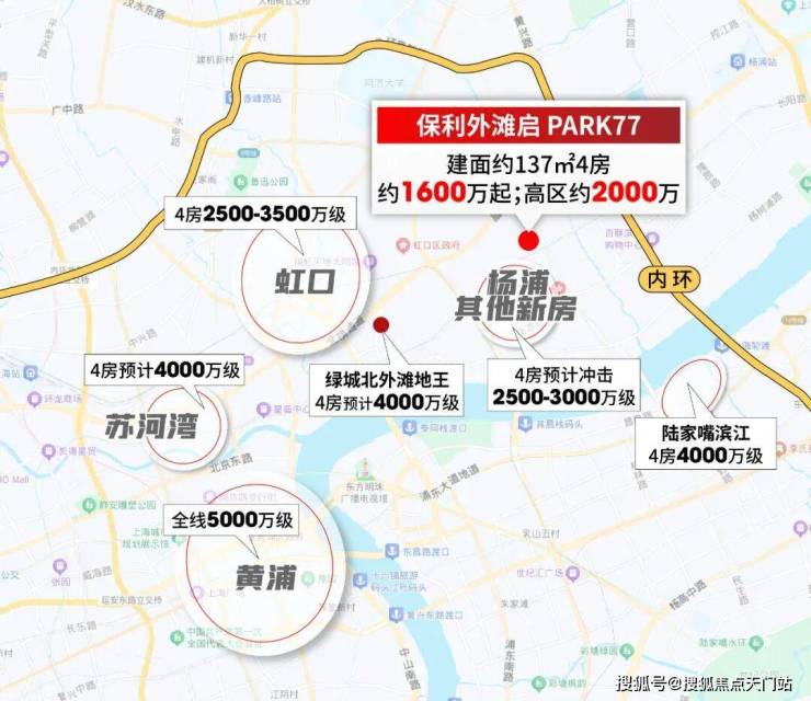 北外滩地王4房预计售价4000万级;虹口其他新房4房价格普遍在2500-3500万;静安苏河湾4房预计4000万级;陆家嘴滨江4房同样4000万级。如此对比之下,保利外滩启PARK77高区2000万级4房的价值,可谓市中心“独一份”。