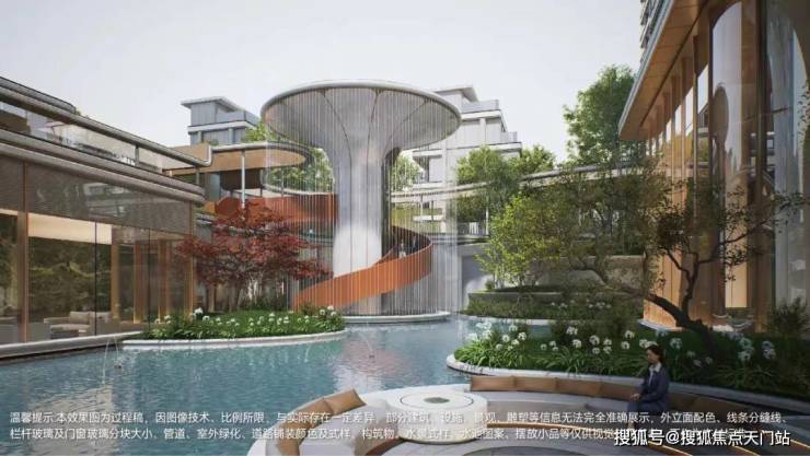 约1600㎡的下沉式庭院里,将山、水、瀑、林等自然意境融入到园林营造中......三座瀑布凌空飞落,水声成为社区的背景音;镜面水景倒映天光云影,树龄逾半百的朴树静立其间,仿若将整座瀑谷搬进城市。而这一切,不再是仅供观赏的“景观”,而是可步入、可停留、可沉浸的生活现场。