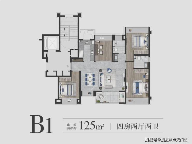 建面约125㎡的四房设计,在空间上使用功能更加扁平化,一站式解决了家庭生活的所有功能,优化居家动线,大大提升空间的居住体验。