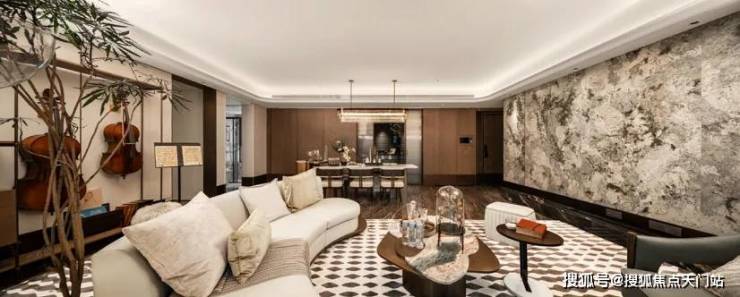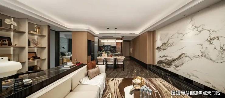 室内空间,是品质最直接的表达。从入户的奢石与金属格栅,到客厅整面铺陈的雪山蓝岩板背景墙,再到 1.8米×0.9米大规格地砖的密拼铺设,细节之处皆是对奢华氛围的精准把控。从一线品牌的厨电卫浴,到四玻两腔的系统窗、全屋的中央空调与新风,这些“内在美”的细节,共同守护着未来居住的健康与舒适度。