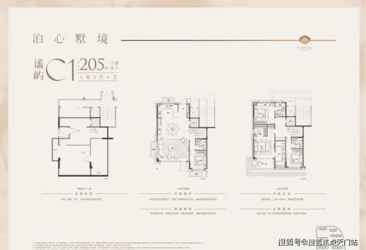 户型特点:下叠边套,南向面宽约9米,客餐厅同宽约5.8米,空间开阔。一楼设南向卧室,采光好且视野佳。二楼为三套房+主卧总统套房设计,主卫南向,可容纳浴缸和双台盆。地下室方正,附赠采光井,利用率高。