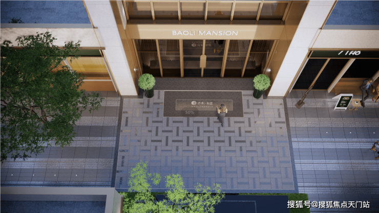 即便是公区部分,「保利虹桥和颂」依旧注重品质, 门楼首层立面通过玻璃与金属的结合打造精致婉约的时尚商业形象,二层通过石材错落有致的拼贴,辅以不同表面的处理方式,展现充满活力的超长尺度形象界面。