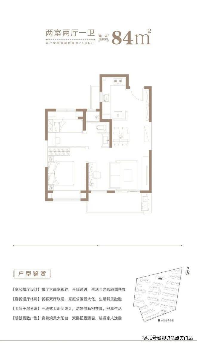 建面约 84㎡2房2厅1卫户型,做到了2+1开间朝南+动静分离+卫生间干湿分离,非常紧凑的2房户型。
