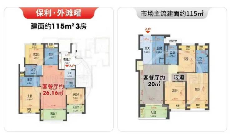 建面约115㎡3房,实得率约93%!常规的同面积产品,也不过约80%上下。