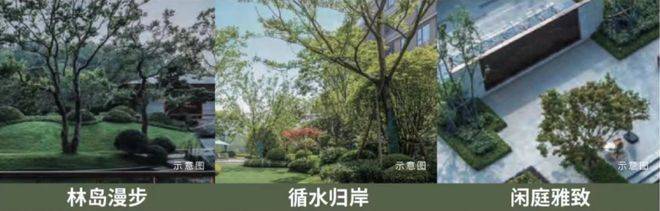 园林方面将围绕中央景观,以 现代艺术手法,打造 森林岛屿景观。内部设置 特色水景,串联不同节点。同时以树木、水系与局部连廊体系融合,共同组建起社区与居所之间的联通介质。