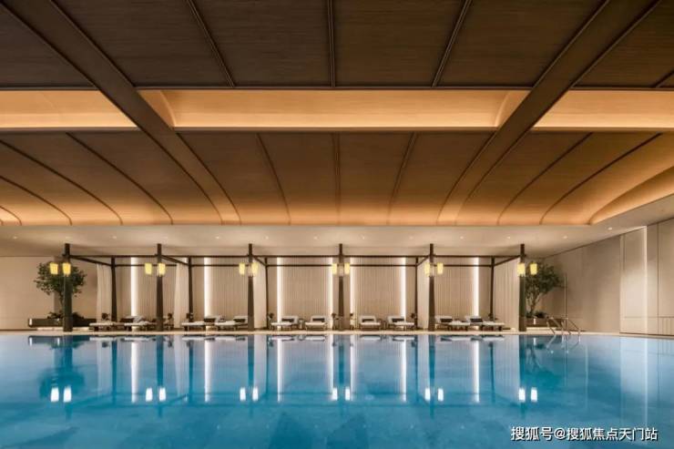 最让我心动的是这个无边泳池!招商序以“室内外自然无界”的设计手法,将无边泳池与庭院美景在视觉上连成一体,当阳光映照跃动的蔚蓝,业主畅游的同时还能包揽庭园诗意;深色木架构撑起白色帏幔,池边躺椅的设计也极具豪华酒店的优雅与尊贵,穹顶则延续着海派穹顶的经典设计元素,以细腻的木纹铝板打造。 以往只在奢华度假酒店的体验在家楼下的会所也能拥有!