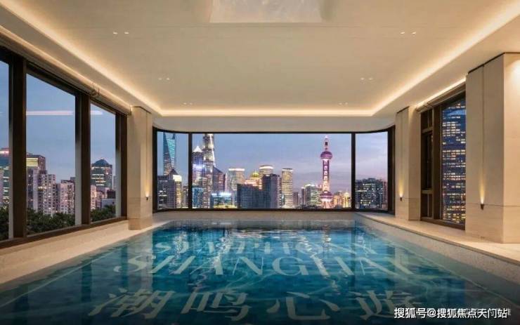 泳池周边以弧形玻璃幕墙围合,外侧可直面陆家嘴 “三件套” 与中央公园绿意,内侧能俯瞰社区内的万国喷泉与果岭草坪