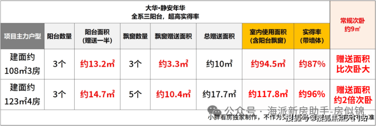 建面约108㎡3房,三阳台面积达约13㎡(赠送一半),飘窗赠送约3.3㎡,室内使用面积达约94.5㎡,实得率高达约87%,总赠送面积比常规次卧都大。