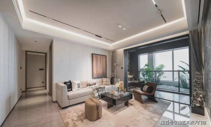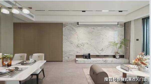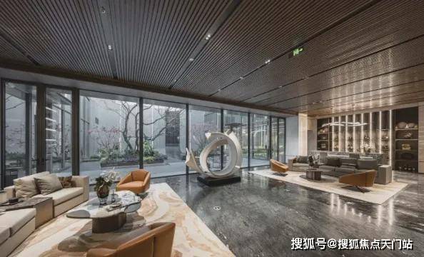 整体效果现代精致,十分符合当下年轻人的审美观;星级酒店式入户门,挑高约7米,宽约60米;石材金属线条背景墙加暖色系夜灯搭配,中庭花园水岛层叠、景墙错落,槭树青红间季节流转的温情脉脉展现,精致的水景让居住者仿若初入剧宴,感受剧目的艺术呈现……