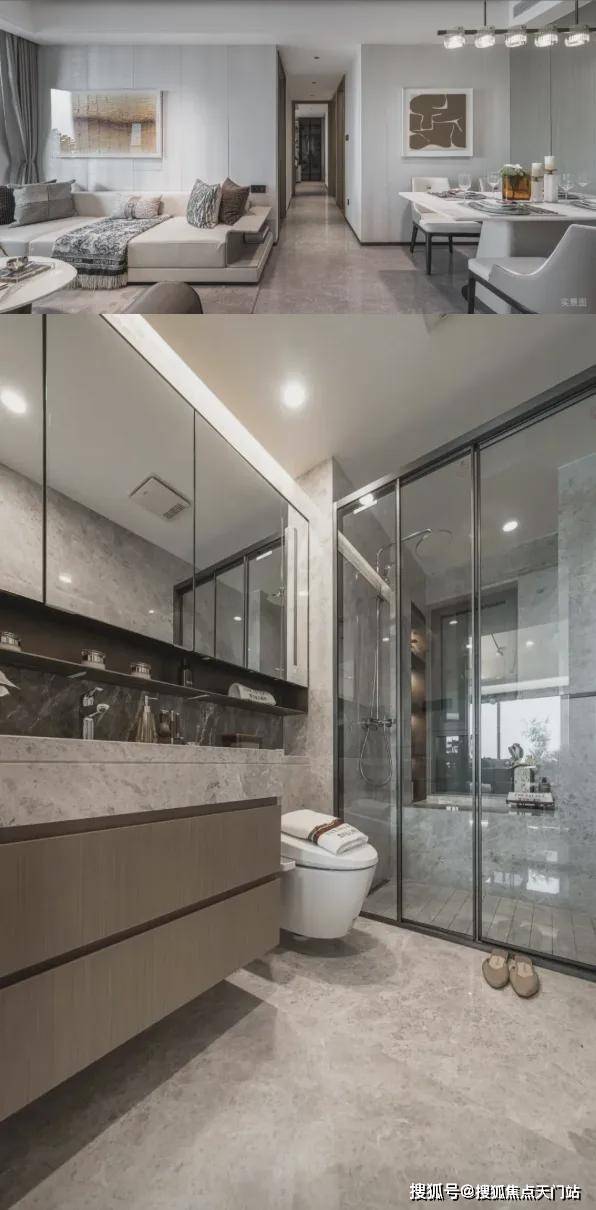 所有户型全屋墙纸交付,连电视机背景墙岩板以及主卧背景墙都是交付标准,卫生间甄选不同的石材,以此来满足功能区的需求。