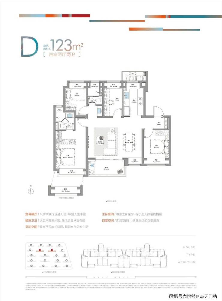 建面约123㎡4房四开间朝南搭配一个巨幕横厅。