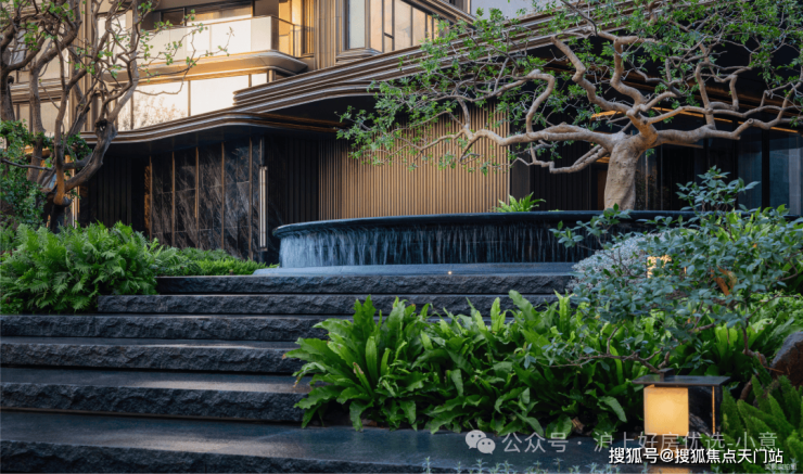 随形就势,流水从近7米的跌水台层层落下,每一层营造不同绿植场景