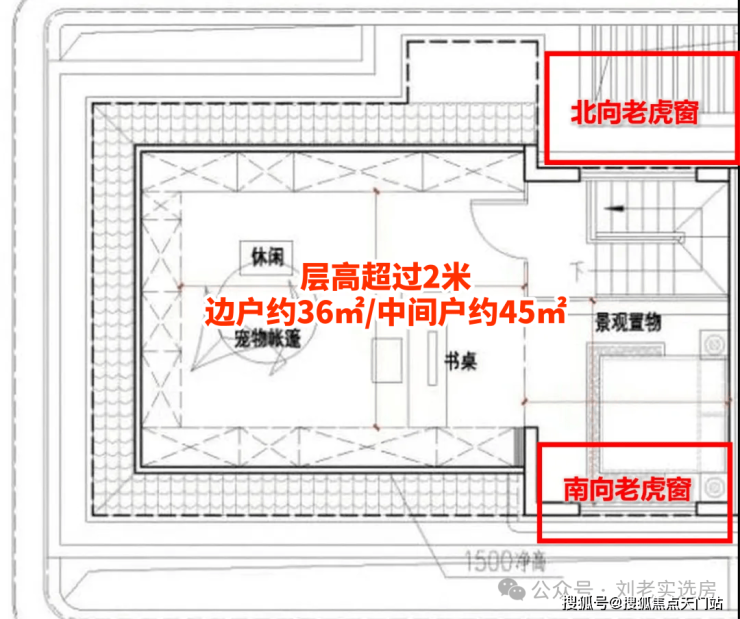 ⑥、项目的所有上叠产品,都规划了层高超过2米的灵动空间 (因屋顶造型因素,边户约36㎡,中间户约45㎡)。