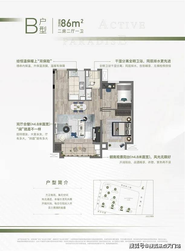 客厅与餐厅连为一体,约4.8米大面宽设计,外连观景阳台,拥揽四季的人生景致。