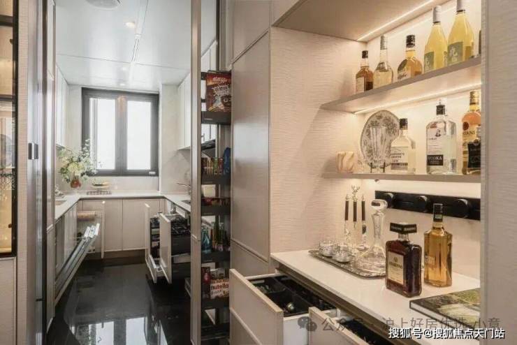 室内设置大金中央空调、新风系统和地暖,搭配斯麦格冰箱。厨房有博世四件套洗碗机、蒸烤一体机、油烟机和灶台。全屋岩板铺装,既耐用又显档次。卫生间干湿分开,配了高仪卫浴、智能马桶、暖风机,主卫还有浴缸和美妆冰箱。