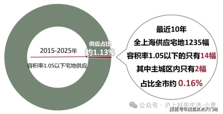 据克而瑞数据统计,2015年-2025年这十年,全上海累计供应1235幅宅地,其中容积率≤1.05的一共只有14块,占比仅约1.13%。更重要的是,这些低密地块绝大多数都地处郊区,主城区的凤毛麟角,仅有2幅!