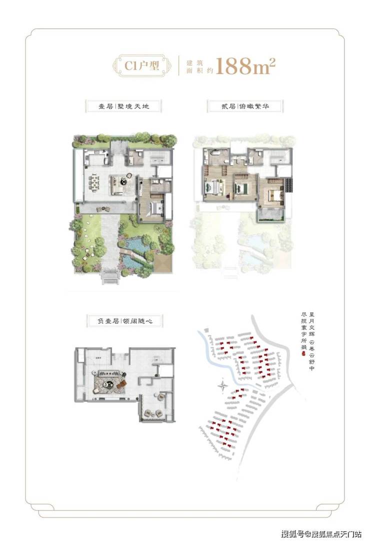 项目二期为纯别墅产品,社区容积率约0.41,面积段约为138-455㎡之间不等,不仅延续了一期多重景观结构,出市入室的仪式感满满,更是提升为围合式院落结构,增加了转角街巷之间的景观点,细节之处尽显大宅风范和业主的雍容气度。除常规的有天有地之外,还配有超高层高地下室及露台。