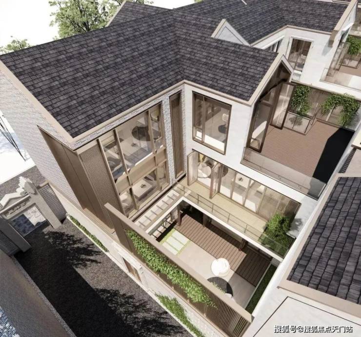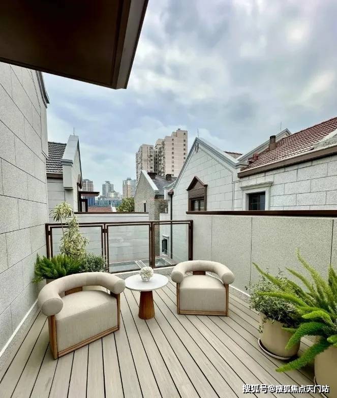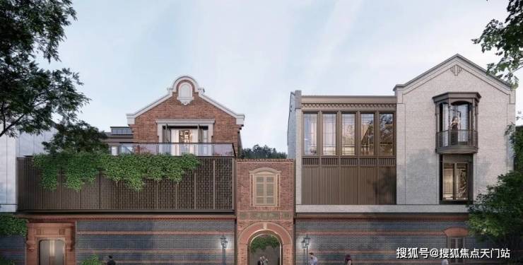从庭园看向别墅, 保留的老山墙、砖楣和门头,再加上悬挑阳台和层层露台 ,这种传统风貌带给人一种重见历史的感慨,又有温馨、宁静的现代舒适感。