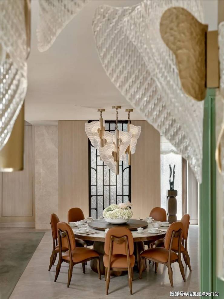 餐厅的设计巧妙融合了老上海的经典元素,圆形餐桌和橘色皮质餐椅在色彩上既现代又充满活力, 顶部的水晶吊灯造型灵感来自上海市花“玉兰花” ,既增添了空间的华丽感,又巧妙地融入了上海的地域特色。
