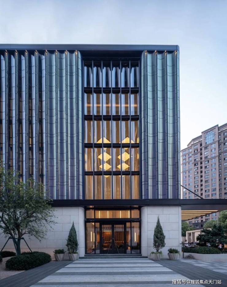 来到项目会所,就被其 流光幻彩铝板的外立面 所吸引。 不同角度有不同颜色呈现,造价昂 贵。大堂的玻璃也很吸睛,用的半钢化夹胶反弯弧玻璃,半径仅为约600mm,施工难度大、成本高!